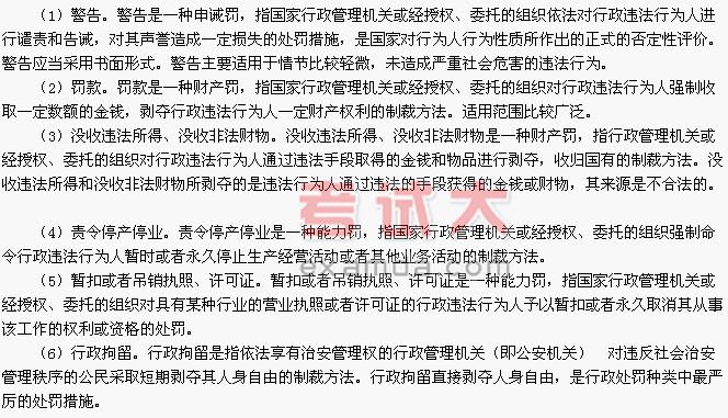 行政處罰法規定行政處罰的種類包括:警告,罰款,沒收違法所得、沒收非法財物,責令停產停業,暫扣或者吊銷執照、許可證,行政拘留,法律、行政法規規定的其他行政處罰。