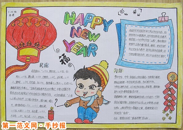春節手抄報:年畫 春節掛貼年畫在城鄉也很普遍,濃黑重彩的年畫給千家萬戶平添了許多興旺歡樂的喜慶氣氛。年畫是我國的一種古老的民間藝術,反映了人民樸素的風俗和信仰,寄託著他們對未來的希望。年畫,也和春聯一樣,起源於“鬥神”。 隨著木板印刷術的興起,年畫的內容已不僅限於鬥神之類單調的主題,變得豐富多彩,在一些年畫作坊中產生了《福祿壽三星圖》、《天官賜福》、《五穀豐登》、《六畜興旺》、《迎春接福》等精典的彩色年畫、以滿足人們喜慶祈年的美好願望。