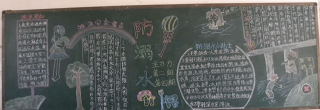 這幅防溺水黑板報排版布局活潑生動,特別是繪畫和黑板報花邊恰到好處,值得學習!