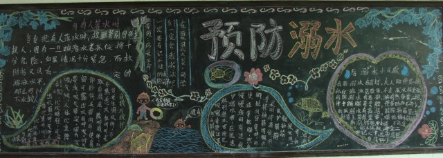 這幅防溺水黑板報製作精美,特別是黑板報花邊和繪畫非常出彩,色彩搭配美觀,欣賞性強!