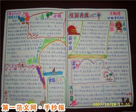 國慶節手抄報圖片:國慶華誕舉國歡詩詞 國慶華誕舉國歡詩詞 慶神州六四華誕,看世界滄海桑田。 崢嶸歲月英雄現,星火燎原映紅天 。 泱泱華夏振宏業,龍騰九宵神箭還。 英雄輩出逢盛世,四化揚帆國泰安。 文明古國數千年,崢嶸歲月多磨難。 山河破碎鎧甲染,滄桑歷盡展尊顏。 勘破百年崎嶇路,紅旗漫捲山河艷。 神州紫氣榮金鼎,六四華誕舉國歡。