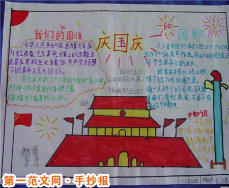 國慶節手抄報:祖國媽媽,生日快樂! 十月,一個金色的日子;十月,一個跳動的音符;十月,一杯清醇的美酒;十月,祖國媽媽的生日。在這充滿詩情畫意的日子裡,我要歌頌您:您是一個火種,點燃開國大典的禮炮;您是一個預言,掀開改革開放的春潮;您是一個火炬,傳遞繼往開來的目標;您是一個引擎,啟動著神舟號飛向太空;您是我們的主心骨,帶領我們走向輝煌。 少年智則國智,少年強則國強。我們這些新時代的少年一定要努力學習,為建設繁榮富強的祖國盡一份綿薄之力。最後,再一次衷心地祝福您:“祖國媽媽,生日快樂!”