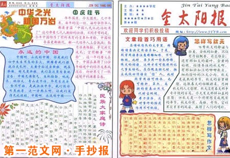 國慶節手抄報:祖國的成長 為了祖國的成長,有太多的人捨棄生命,有太多的人嘔心瀝血,將自己畢生心血與青春傾注在這片土地。而今天,我們偉大的祖國母親已站了起來,重新站回了世界,讓所有罵過我們“東亞病夫”的人瞧瞧,中國已經崛起,作為中國人,我們已不在膽怯,懦弱。我們的祖國已輝煌騰達,振翅一飛,已再次飛上雲霄,向世界發出我們最動聽的語言,自豪的告訴他們:中國人民從此站起來了!