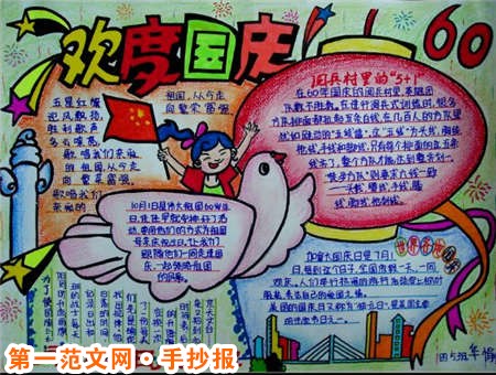 國慶節手抄報:熱愛祖國 捐軀赴國難,視死忽如歸,正是由於對祖國的深切熱愛,勤勞智慧的中華兒女共同開拓了遼闊的疆域,創造了輝煌燦爛的文化。肩負著實現中華民族偉大復興的我們,要熱愛祖國的大好河山,積極維護祖國的主權獨立和領土完整,祖國的領土寸土不能丟,不能被分裂侵占;要熱愛祖國的歷史和文化,提高民族自尊心和自信心,為創造更加輝煌的民族文化而盡心盡力。