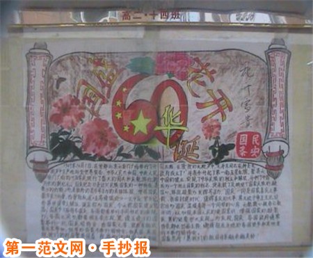 國慶節手抄報:國慶節是一個快樂的節日 每年的十月一日是一年一度的國慶節,是我們偉大祖國母親的生日。伴隨著風風雨雨,我們的母親祖國已經55周歲了,這一天,舉國上下都在歡度慶祝這一節日。 遠方北京的叔叔打來電話告訴我們,北京國慶熱鬧非凡。我很想去北京,看看天安門,看看我們偉大首都的面貌,我和叔叔已經約好明年暑假一起同暢遊北京。 國慶節是一個快樂的節日,人民的生活水平真的提高得很快。我們在祖國媽媽的懷抱中,幸福、快樂地成長,願祖國媽媽永遠美麗、永遠繁榮,願祖國一年比一年興旺、發達!