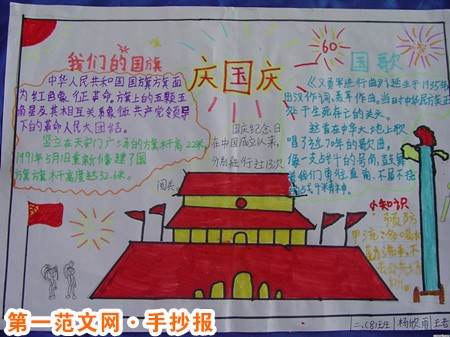 國慶節手抄報:國慶節一詞 “國慶”一詞,本指國家喜慶之事,最早見於西晉。西晉的文學家陸機在《五等諸侯論》一文中就曾有“國慶獨饗其利,主憂莫與其害”的記載、我國封建時代、國家喜慶的大事,莫大過於帝王的登基、誕辰(清朝稱皇帝的生日為萬歲節)等。 因而我國古代把皇帝即位、誕辰稱為“國慶”。 今天稱國家建立的紀念日為國慶。 在我國,國慶節特指中華人民共和國正式成立的紀念日。