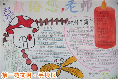 教師節手抄報資料:老師是不滅的火種 老師是不滅的火種,點燃學子心中的理想,點燃學子心中的希望。星星火種,燎原之勢,它給了學子生活的樂觀,學習的積極,工作的激情。火種的存在,給人無限老師,您是一股清泉,流過密林山野,淌過深溝淺灘,永不乾竭。高山擋不住您的川流,暴雨只會壯大你的軀幹。每每挑燈夜讀,是為豐富自己的源頭;每每戴星批閱,是為灌溉無知的田野。那清澈見底的山泉,代表著一身正氣,永遠與骯髒的溪流劃清界線。您奔流不息,是為了完成您崇高的使命:滋潤每一寸缺水的土地。