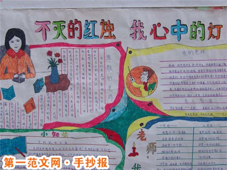 教師節手抄報:敬愛的老師 用語言播種,用彩筆耕耘,用汗水澆灌,用心血滋潤,這就是我們敬愛的老師崇高的勞動。 您工作在今朝,卻建設著祖國的明天;您教學在課堂,成就卻在祖國的四面八方。 老師,如果把您比作蚌,那末學生便是蚌里的砂粒;您用愛去舐它,磨它,浸它,洗它……經年累月,砂粒便成了一顆顆珍珠,光彩熠熠。
