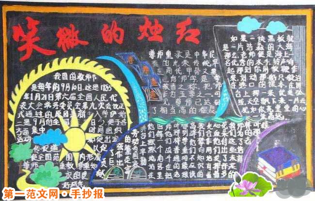 這幅教師節黑板報圍繞“微笑的紅燭”對老師進行讚美,排版布局美觀,字型工整,是一份漂亮的黑板報!