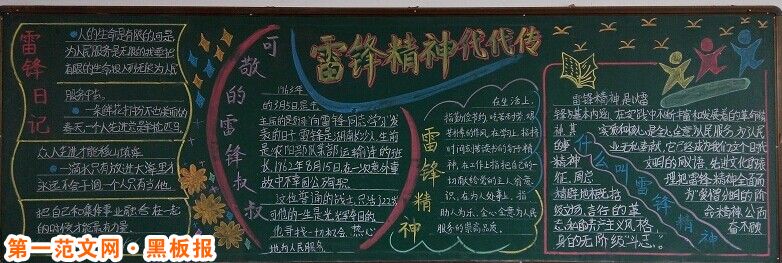 學雷鋒黑板報:團結友愛 雷鋒把自己的藏書拿出來供大家學習,被人們稱為"小小的雷鋒圖書館"。他幫助同志學習知識,同班戰友喬安山文化程度低,雷鋒就手把手地教他認字,學算術。同班戰友小周父親得了重病,雷鋒知道後以小周的名義給家裡寫了信又寄去10元錢。戰友小韓在夜裡的出車中棉褲被硫酸水燒了幾個洞,雷鋒值班回來發現後,把自己的帽子拆下來一針一針地為小韓補好褲了,輕輕地蓋在他身上。知道這個情況的喬安山說:"為了給你補褲子,雷鋒半宿都沒睡!"
