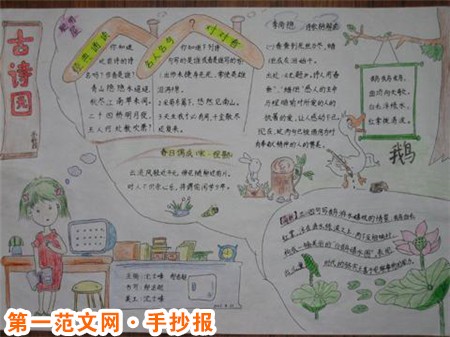 國小生手抄報內容:古詩園 《江南》 樂府民歌 江南可採蓮,蓮葉何田田。魚戲蓮葉間。魚戲蓮葉東,魚戲蓮葉西,魚戲蓮葉南,魚戲蓮葉北。 《敕勒歌》 北朝民歌 敕勒川,陰山下。天似穹廬,籠蓋四野。天蒼蒼,野茫茫,風吹草低見牛羊。 《詠鵝》 駱賓王(唐) 鵝,鵝,鵝,曲項向天歌,白毛浮綠水,紅掌撥清波。 《風》 李嶠(唐) 解落三秋葉,能開二月花。過江千尺浪,入竹萬竿斜。 《詠柳》 賀知章(唐) 碧玉妝成一樹高,萬條垂下綠絲絛。不知細葉誰裁出,二月春風似剪刀。