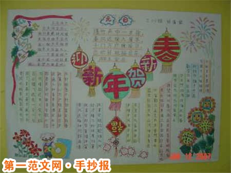迎新年手抄報:賀新春 聽著聲聲爆竹,看著朵朵煙花,人們都在等待著另一個得開始。“新年”正穿著旱冰鞋,在五彩得大道上前進著,與我們拉近了距離。 新的一年,新的開始,我們大了一歲,我們也正朝著夢想的殿堂進發。 今年的雪比往年都大,這讓我回想起去年元旦時候的場景,讓我鼻尖不禁一酸。我姐的那一年的元旦也是下了好大好大的雪,很感謝雪,我們還有了很多的回憶。