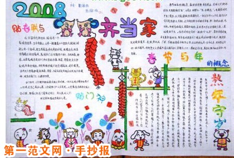 迎新年手抄報:北京新年習俗 自進入臘月以後,就有文人墨客在市肆檐下書寫春聯,以圖掙些銀子過年。祭灶之後,新春聯漸次粘掛,千家萬戶煥然一新。有的人家用朱箋,有的用紅紙,只有內廷及宗室王公等按例用白紙,鑲以紅邊藍邊,不是宗室者不得擅用。 臘月將梅束起放在一個腹大口小的器具中,放置於地下五尺左右的地方,燃火,讓地微微有些溫暖,梅花就會漸漸放白,用紙籠之,到市上去賣,小桃、郁李、迎春都可如此。繁盛之區,支搭席棚,售賣畫片,婦女兒童爭相購買,以為樂。