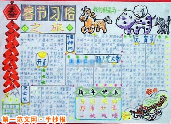 迎新年手抄報:廣東醒獅 醒獅屬於中國獅舞中的南獅,是一種地道的廣東省漢族民間舞蹈,是廣東舞苑中的一寶。歷史上由唐代宮廷獅子舞脫胎而來,五代十國之後,隨著中原移民的南遷,舞獅文化傳入嶺南地區。明代時,醒獅在廣東出現,起源於南海縣。現流傳於廣東、廣西及東南亞各國華僑中間;在廣東境內主要分布在佛山、遂溪、廣州等縣市。廣東醒獅被認為是驅邪避害的吉祥瑞物,每逢節慶,或有重大活動,必有醒獅助興,長盛不衰,歷代相傳。