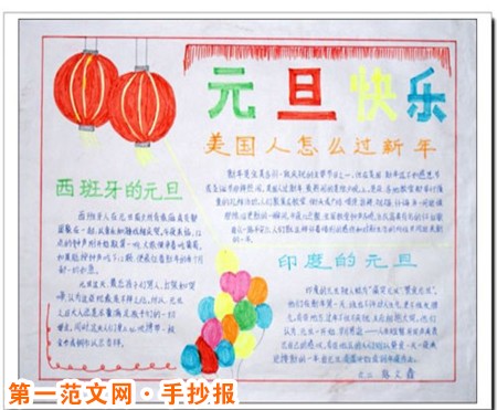 元旦手抄報:元旦到,問個好 元旦佳節不收禮,要收只收人民幣,現金紅包加福利,通通屬於你;元旦佳節不送禮,要送只送簡訊息,健康幸福添如意,統統跟隨你;快樂元旦! 元旦到,問個好,願你開心困難少;青春駐,不變老,全家天天呵呵笑;兒女孝,幸福繞,憂愁全部上雲霄;健康在,收入高,幸福生活樂逍遙。 歲月如歌蝶戀花,新年朝陽艷如畫。元旦喜慶福相隨,天地共舞春又歸。白雪紛飛送福至,紅霞滿天寄心意。真誠話語不多說,敬祝佳節多快樂。