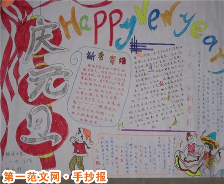 元旦手抄報:新的一年 新的一年,我希望我的家人、我的家庭開開心心、其樂融融;新的一年,我希望我的同學、我的班級永不分離、團結和睦;新的一年,我希望我的老師、我的朋友快樂健康、天天向上…… 此刻,窗外又響起了噼里啪啦的鞭炮聲,這是人們告別舊年的戀戀不捨,也是人們對新年的美好憧憬。這個新年總是讓人有所期待,總是那么的煽情。