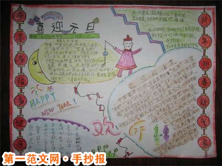 元旦手抄報:輕快的腳步 流逝的光陰把歲末的幕布輕輕放下,XX年就踏著輕快的腳步飄然遠去。十二個月的故事,依舊在墨香染透的清箋上留下平靜溫情的絡印。默然回首,喜悅、歡欣、感傷、遺憾…… 當您看見這信息時,幸運已降臨到你頭上,財神已進了您家門,榮華富貴已離您不遠.祝福您朋友:新年快樂!