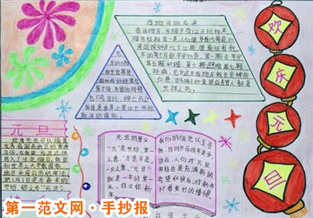 元旦手抄報:特別的元旦 元旦,意味著你去年的煩惱統統要完旦;元旦,意味著你今年的願望全部要圓滿,一句元旦快樂,不能代表我的心,那我就多說一句,元旦快樂,快樂元旦,在我記憶的畫屏上增添了許多美好的懷念,似錦如織!請接受我深深的祝願,願所有的歡樂都陪伴著你直到永遠。特別的元旦給你特別的祝福。 新年歲首,又是一年的開頭,一個新的希望的開端,在漫天的鞭炮中開始,也將在漫天鞭炮中結束,充滿夢想的未來正徐徐張開她斑斕的畫軸,為我們打開了一片新的天地。