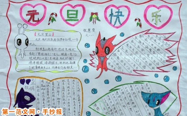元旦手抄報:每一個祝福 每一朵雪花飄下,每一個煙花燃起,每一秒時間流動,每一份思念傳送,都代表著我想要送你的每一個祝福:元旦快樂! 我呼吸著這清新的空氣,我知道,這種空氣是特有的,在新年特有的情況下,我呼吸著。為此,我很自豪,自豪我們的世界,我們的自然,我們所擁有的一切。我知道,它們為我灌輸著的不僅是生命,還是一個希望,新的希望!