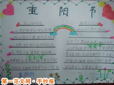 重陽節手抄報:黃花紫菊傍籬落 九日 (楊衡) 黃花紫菊傍籬落,摘菊泛酒愛芳新。 不堪今日望鄉意,強插茱萸隨眾人。 奉和九日幸臨渭亭登高得枝字 (韋安石) 重九開秋節,得一動宸儀。 金風飄菊蕊,玉露泣萸枝。 睿覽八紘外,天文七曜披。 臨深應在即,居高豈忘危。 踏莎行 (庚戌中秋後二夕帶湖篆岡小酌沸療? 夜月樓台,秋香院宇,笑吟吟地人來去。是誰秋到便淒涼?當年宋玉悲如許! 隨分杯盤,等閒歌舞,問他有甚堪悲處?思量卻也有悲時,重陽節近多風雨。