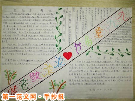 重陽節手抄報:九日齊山登高 奉陪封大夫九日登高 【唐】岑參 九日黃花酒,登高會昔聞。 霜威逐亞相,殺氣傍中軍。 橫笛驚征雁,嬌歌落塞雲。 邊頭幸無事,醉舞荷吾君。 九日齊山登高 【唐】杜牧 江涵秋影雁初飛,與客攜壺上翠微。 塵世難逢開口笑,菊花須插滿頭歸。 但將酩酊酬佳節,不用登臨恨落暉。 古往今來只如此,牛山何必獨沾衣。