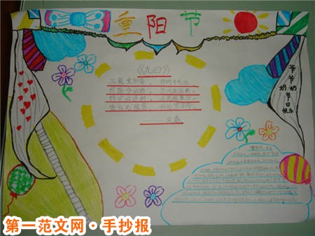 重陽節手抄報:共醉重陽節 登高(杜甫) 風急天高猿嘯哀,渚清沙白鳥飛回。 無邊落木蕭蕭下,不盡長江滾滾來。 萬里悲秋常作客,百年多病獨登台。 艱難苦恨繁霜鬢,潦倒新停濁酒杯。 九月九日玄武山旅眺 (盧照鄰) 九月九日眺山川,歸心歸望積風煙。 他鄉共酌金花酒,萬里同悲鴻雁天。 秋登蘭山寄張五 (孟浩然) 北山白雲里,隱者自怡悅。相望始登高,心隨雁飛滅。 愁因薄暮起,興是清秋發。時見歸村人,沙行渡頭歇。 天邊樹若薺,江畔洲如月。何當載酒來,共醉重陽節。