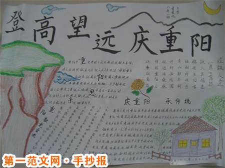 重陽節手抄報:登高望遠 子女對父母有贍養扶助的義務。(俗語) 你不同情跌倒在地的老人,在你摔跤時也沒有人來扶助。(印度諺語) 用毆打來教育孩子,不過和類人猿教養它的後代相類似。(馬卡連柯) 尊老愛幼應從身邊的小事做起。