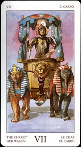 這張牌描繪的是克服障礙、獲得勝利的王者戰車。牌面上的勝利者以一種強有力的姿態站在戰車上,展現他在人世間的豐功偉業。拉動戰車的一黑一白兩隻獅子,時刻準備繼續前進。