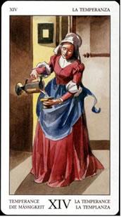 牌面描述的是天使雙手拿著兩隻聖杯,它們分別代表“物質”和“精神”,她在不停地用聖杯相互倒水,試圖使兩隻聖杯的水保持平衡。 它告誡我們當面對各種各樣的誘惑時,控制好自己的欲望是最重要的。它不象其它牌一樣有著快樂和成功,讓我們感到種平淡的美,畢竟平淡的生活才是真正的幸福。