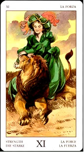 這張牌中勝利女神彎著腰正在撫摸一頭兇猛的獅子,並用她的溫柔與愛來安撫著懷中代表恐懼的獅子,它是愛與堅強意志的象徵。正是因為有了愛與意志,人類才能克服困難,在歷史的長河中不斷前進。 獅子代表人類的本能,而美女則象徵愛情和服從,二者必須保持和諧,互相支持才能成為征服世界的力量。此外它還意味著你有能力解決現在所面臨的困難局面,並對自己內在的力量充滿信心。