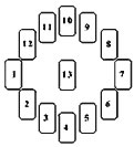 2、再依序取出剛才所拿之牌後面的第一張到第十二張牌,放在圖示中(2)到(13)的位置。