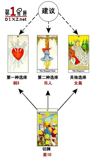 在第一種選擇上,他抽出的牌是劍3,表示如果選擇這一專業,他應該能得到良好的發展,並能有所回報。這張牌呈現的是一種很正面的信息。