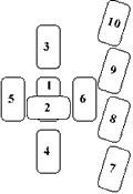 1、依一般方式洗牌、切牌。將由上面數來的第七張牌放在如圖示(1)的位置。