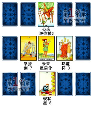 代表問卜者現在狀況的牌是星8,表示現在的狀況離問卜者的期望相差甚遠,她希望能有所改變,卻因了解不到情況而找不出好的方法。