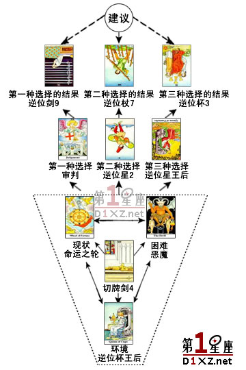 原本是三個都還算合問卜者心意的追求者,可牌上卻顯示出了一連串的逆位。其實所有的戀愛,一開始都會感覺良好,否則也不會開始戀愛。但隨著了解的深入,缺點就會暴露出來。在這一例中,選擇甲,問題是如何讓他擺脫對舊日戀人的執迷;選擇乙,一是首先要保持自己情緒的穩定,二是要改變對立的環境;選擇丙,那么就必須下功夫去改變對方,改變他不負責任的習性。