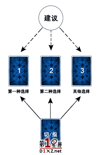 在這裡,尤其要注意切牌或指示牌對別的牌的影響。因為這種影響可能影響到占卜者的最後判斷。除此之外,牌陣中的三張牌互相之間不產生影響,這與後面要介紹的諸多牌陣大為不同,因此也表明這是一個最簡單的牌陣。