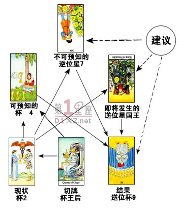 生活能改變人,但並不是都向好的方面改變。有的時候,一件旁人看來很小的事情,就會導致一個人做人方向上的改變,這在一個人的人生觀尚未完全定型的青年時代尤為可能。這個實例中,牌面展示的這種發展趨勢存在著邏輯上的可能性。問卜者剛接觸社會,滿懷美好的期望,對什麼事都以正面的眼光看待,以為世界充滿陽光。但一旦遭遇一些隱暗的行為,就會給他造成深重的心理創傷,甚至導致他做人方向上的改變。