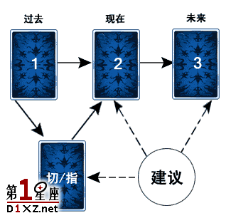 第一張牌代表過去,表示已經發生過的事情;第二張牌描述的是當前的情況,也是一種純客觀的反映;第三張牌表示如果放任事情發展,不發生任何作為,事情將會出現什麼結果,是一種地未知的判斷。過去、現在、未來由左至右平行排列,切牌或指示牌位於三張牌的下方。切牌表示問卜者當時的心態,是一種主觀反映。指示牌則代表了當事人的基本特質。