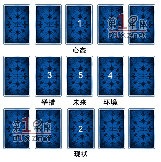 第一張牌表示的是問卜者目前的心態;第二張牌表示的是問卜者現在的狀況;第三張牌顯示的是問卜者採取的舉措;第四張牌顯示的是戀愛雙方周圍的情勢,即環境;第五張牌表示兩個關係未來的狀況。