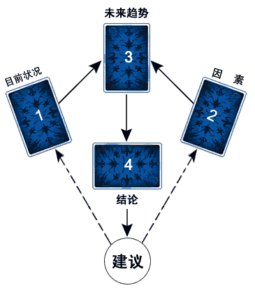按照牌擺放的順序進行。先解釋當事人現在的狀況,再解釋與對方關係過去的緣起,然後解釋雙方關係的未來發展趨勢,最後解釋第四張牌。全部解釋後,綜合所有信息對問卜者提出建議。