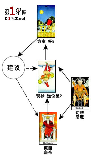 代表目前狀況的是逆位星2,表示他現在的生活也極不安定,這與前面切牌說他生活沒有規律形成了呼應。