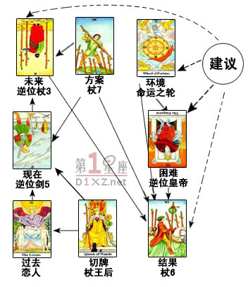 這一例與前邊的一例有相似之處,但前者的發展起伏要大一些,後者則相對穩定;前者面臨更大的困境,後者控制局面的能力更強。可在提出建議上,對後者建議的難度,恐怕絲毫不小於前者。對於牌面較好的占卜,一般都存在這個問題。因為看起來一切都非常樂觀,似乎不需要有什麼改變和預防。但古語道,生於憂患,死於安樂,在看似樂觀的局面下,往往潛伏著極大的危險,更應該高度重視。