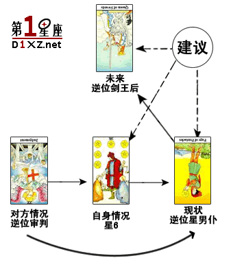 表示未來發展情況的牌是逆位劍王后,說明雙方以後發展關係的可能性不大。