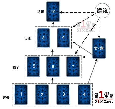 與別的牌陣的一致的是,十張牌表示的是事情發展的脈絡,切牌反映的是當事人的想法。如使用指示牌,則表示當事人的特質。