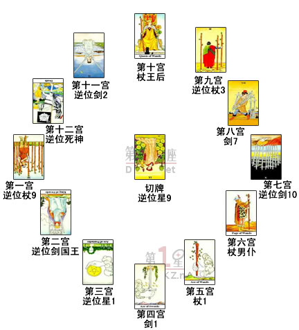 第十宮是杖王后,表示問卜者將會是溫柔女性的幫助,他的努力將得到回報。這張牌與劍7牌形成了呼應,可能是一次由友誼轉變成的愛情。