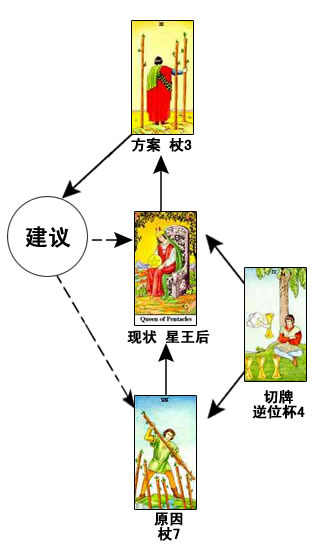 從逆位杯4、杖7到星王后,牌陣的線路呈現出一種邏輯上的統一,表明問卜者自身的問題是造成別人對他敬而遠之的關鍵。問卜者身上的毛病是從小養成的,他對自己並沒有清醒的認識,要改變當然也不是一日之功。