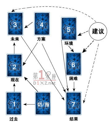 代表過去的第一張牌表示已經發生過的各種情況;第二張牌表示現在正存在的狀況;第三張牌表示未來將要出現的狀況;第四張牌是面對未來的情況可以選擇的行動方案;第五張牌是指本人無法控制的一些環境因素;第六張牌是指這件事情的發展中會遇到的困難;第七張牌表示最終可能出現的結果。