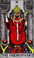 這是一張代表喚醒良心與善良覺醒的牌,同時也是張關於宗教信仰與傳統的牌。同皇帝所代表的物質主宰相比,他更趨向於精神層面,他是精神方面的權威,是未知世界的解釋者。因為教皇能夠直接與上帝聯繫,他用慈悲與洞察力試圖拯救世人的靈魂,並用自己的言論引導人們走向正途。