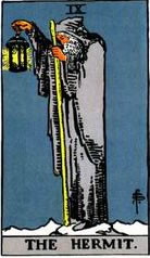 隱士身著長袍,提著一盞燈、拄著拐杖,在黑暗中孤獨地摸索前進。這張牌代表獨處,隱士試圖放棄外在的誘惑,而達到內心的平靜,進而在寂靜的環境裡通過冥想得到真理。寂靜中只能聽 到自己內心發出的聲音,所以才能夠更好地理解自己的想法,尋找到一個真正屬於自我的最終目標。