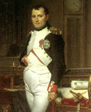 拿破崙·波拿巴(1769~1821)。法國資產階級政治家和軍事家、法蘭西共和國第一執政(1799~1804)、法蘭西第一帝國和百日王朝皇帝(1804~1814,1815)。生於科西嘉島阿雅克肖城破落貴族家庭。布里埃納軍校畢業,後在巴黎軍事學院肄業。1785年任炮兵少尉。受啟蒙思想影響,參加法國革命。雅各賓專政時期任炮兵上尉。1793年,出色指揮土倫戰役,擊潰王黨軍隊,獲少將銜。督政府時期因與雅各賓派關係密切,一度被捕。1795年10月,任法軍統帥,鎮壓王黨軍叛亂。1796年率軍進攻義大利,1798年侵入埃及。1799年回國。發動政變(11月9日,共和新曆霧月18日),成立執政府,自任第一執政。1804年稱帝,建立法蘭西第一帝國。頒布民法(即《拿破崙法典》)、商法和刑法,鞏固資產階級革命成果。對內鎮壓王黨復辟勢力;對外多次粉碎反法聯盟,嚴重打擊歐洲封建勢力。後逐步對外侵略擴張,與英、俄爭霸。1812年對俄戰爭失敗。1814年反法聯軍攻陷巴黎,被流放於厄爾巴島。1815年重返巴黎,建立百日王朝。滑鐵盧戰役失敗後被流放於聖赫倫那島。1821年病死於該島。